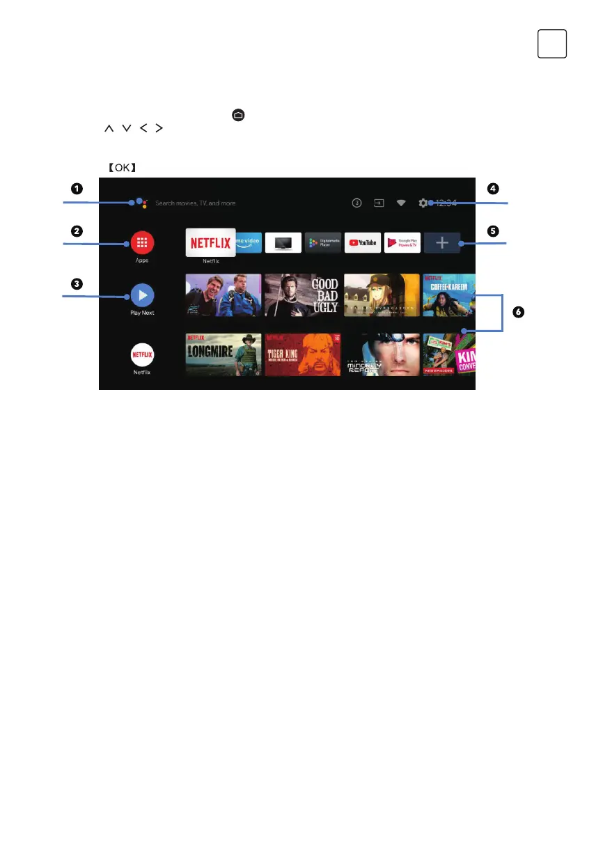 (Google Pomočnik), Apps (Aplikacije), Play Next (Predvajaj naslednje), Netflix, YouTube in drugimi na
