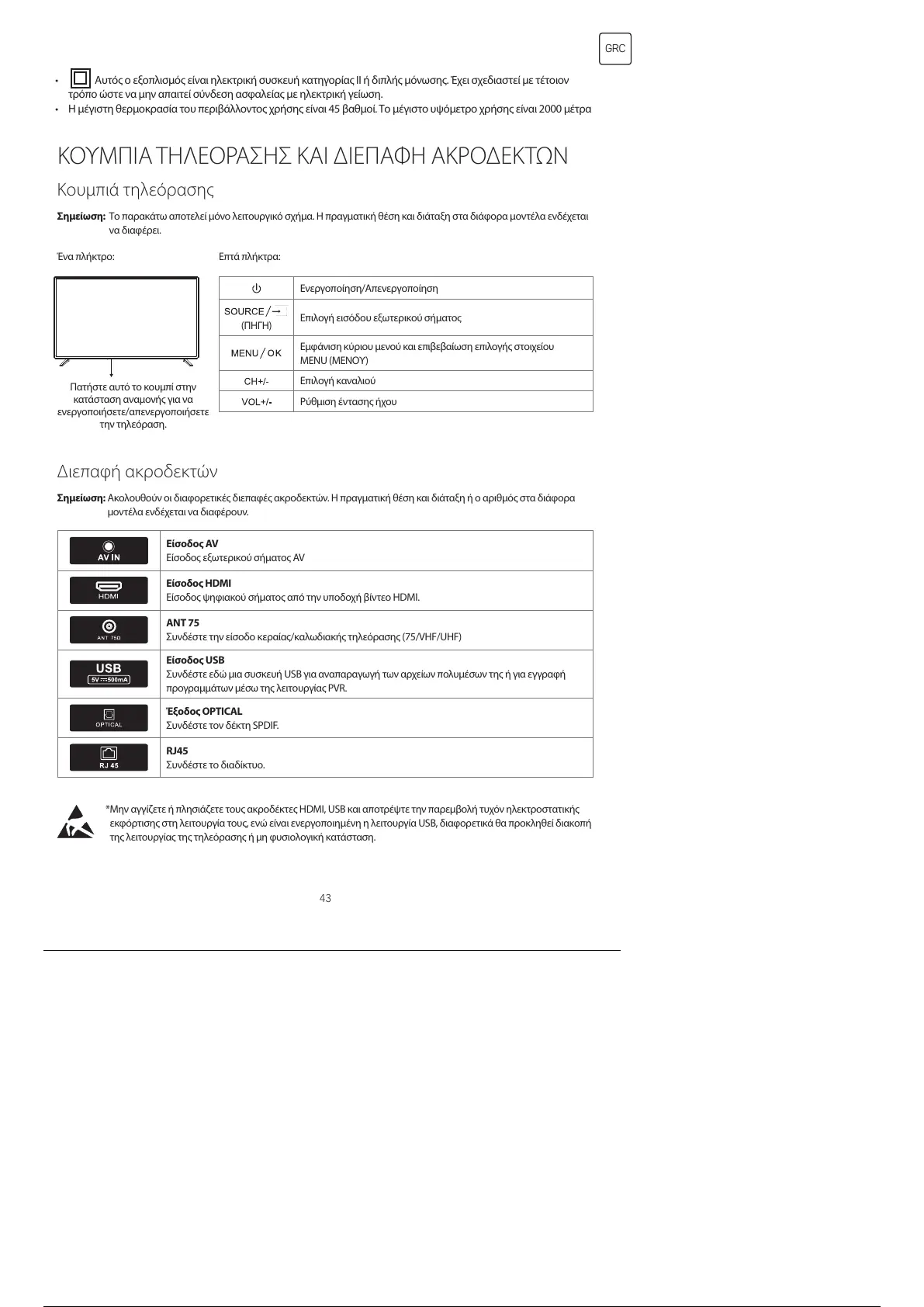 * Μην αγγίζετε ή πλησιάζετε τους ακροδέκτες HDMI, USB και αποτρέψτε την παρεμβολή τυχόν ηλεκτροστατικής