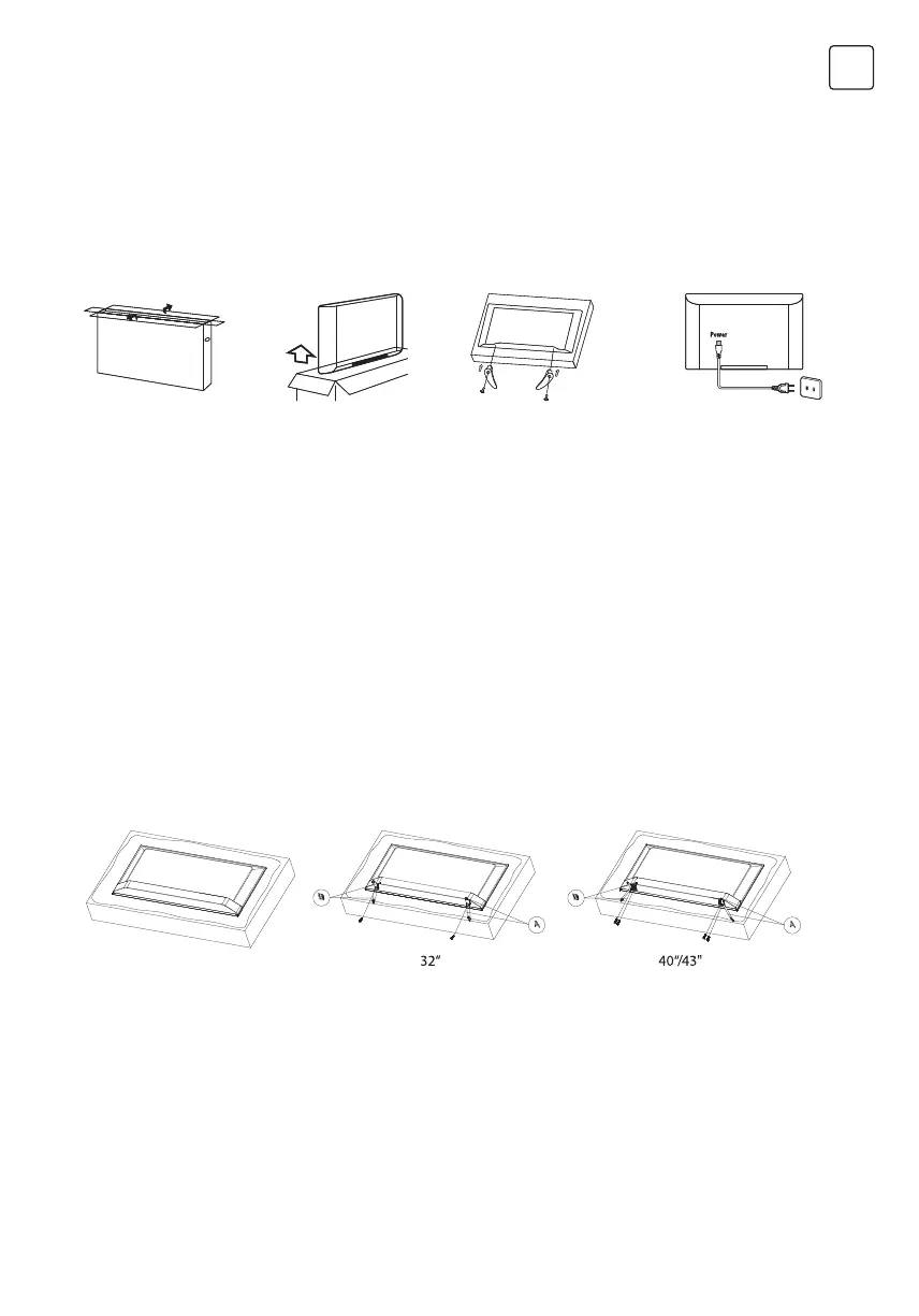 2. Take out the TV. 3. Install the TV stands.