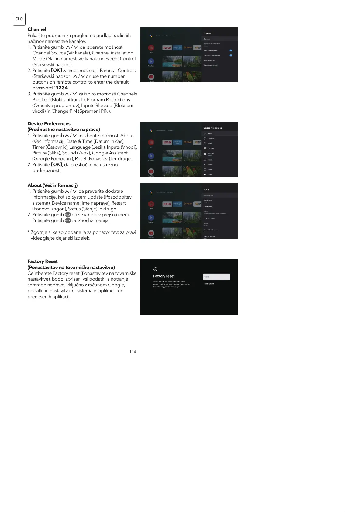 Če izberete Factory reset (Ponastavitev na tovarniške