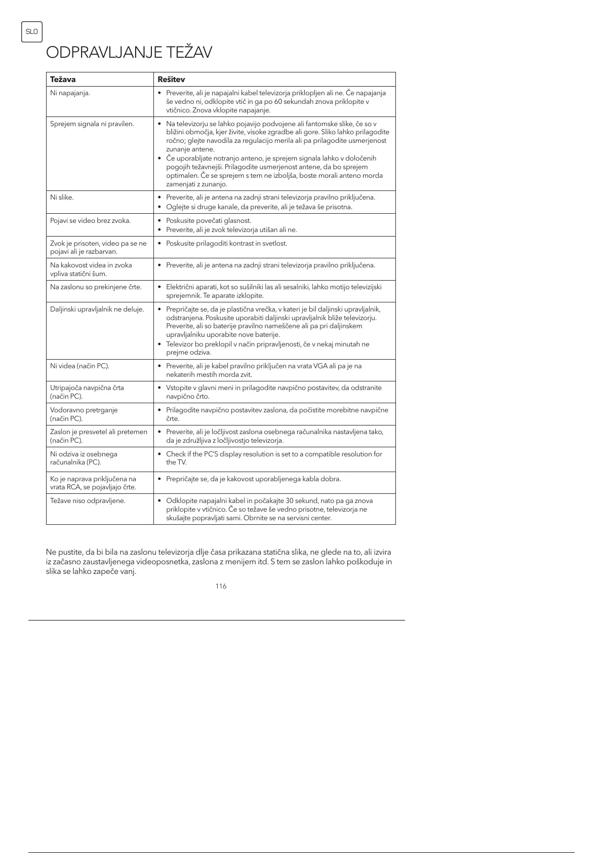 Ne pustite, da bi bila na zaslonu televizorja dlje časa prikazana statična slika, ne glede na to, ali izvira