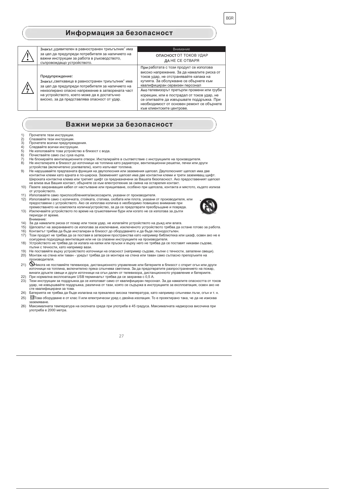 26) Максималната температура на околната среда при употреба е 45 градуса. Максималната надморска височина при
