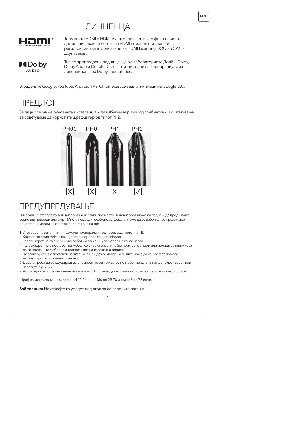 Шраф за монтирање на ѕид: M4 od 22-24 инчи, M6 od 28-70 инчи, M8 oд 75 инчи.