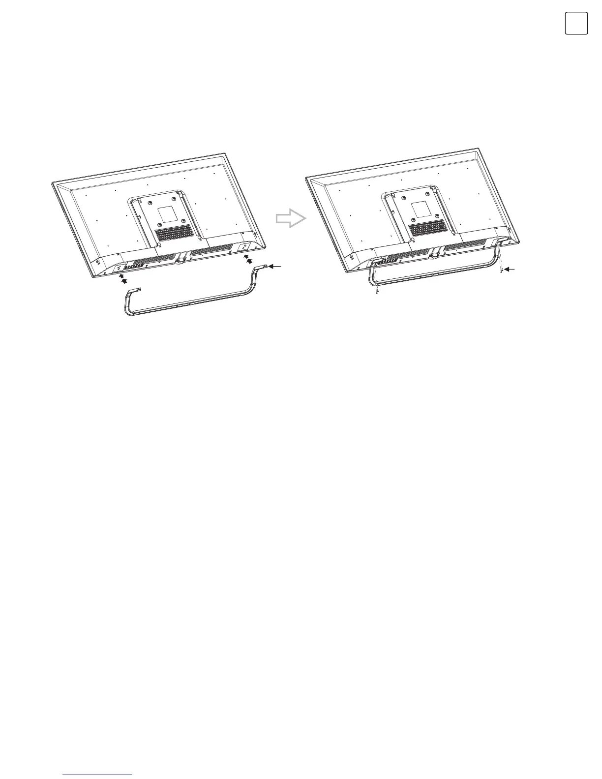 Položite TV na ravno površino, kot je prikazano na sliki , in sicer tako, da gre spodnji del televizorja na zunanji rob.