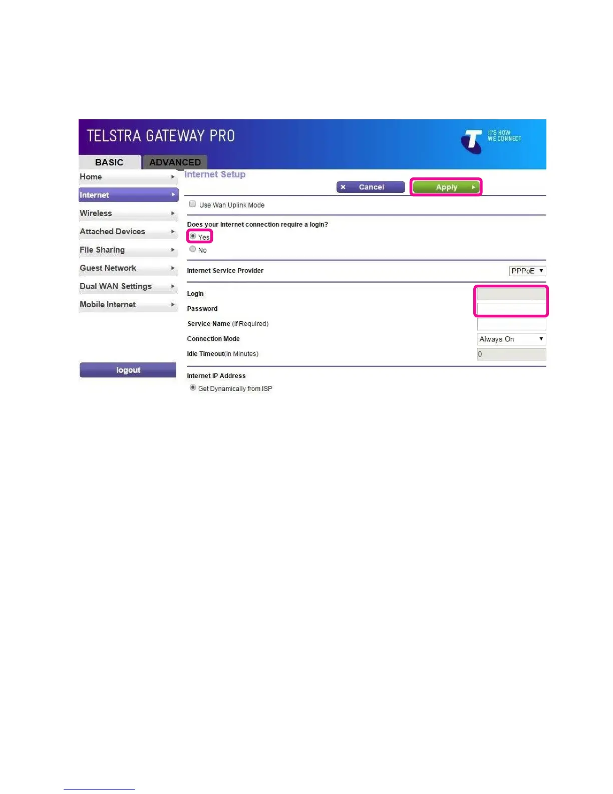 Enter your full Username (Login) and case sensitive Password into the correct elds and click Apply.
