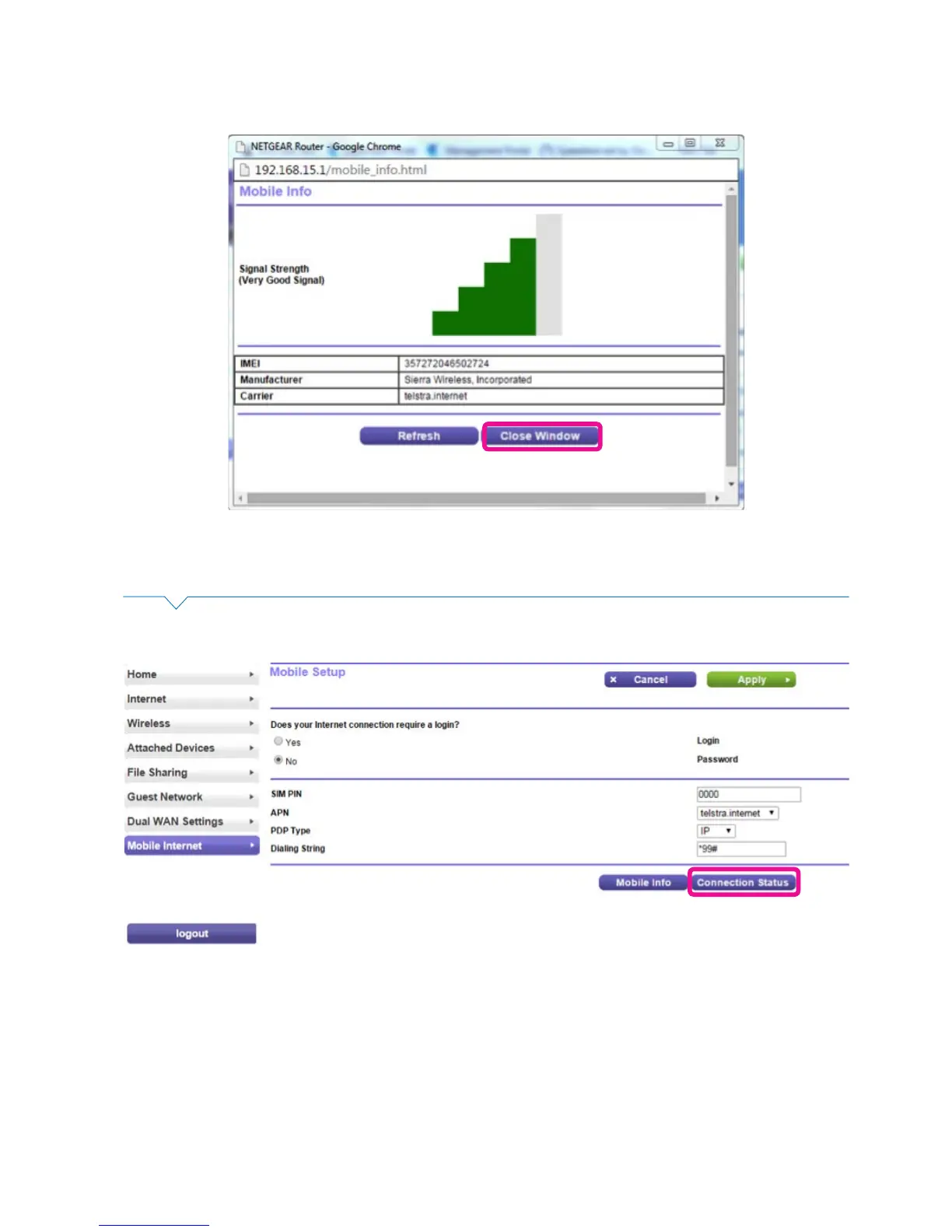 A pop-up window will show the mobile device signal strength. Click Close Window.