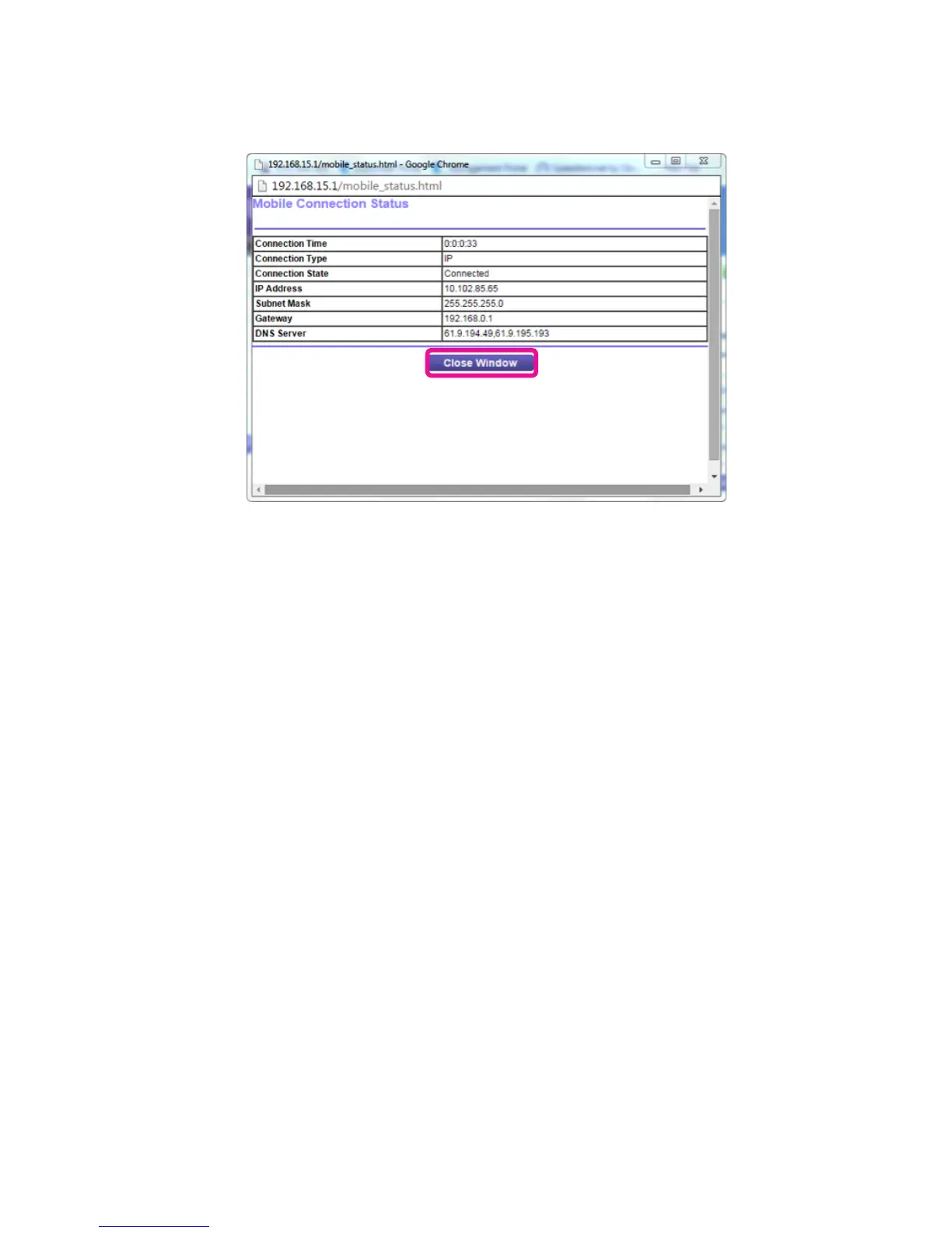 Click Connection Status. A pop up window will show the Connection State and assigned IP address,