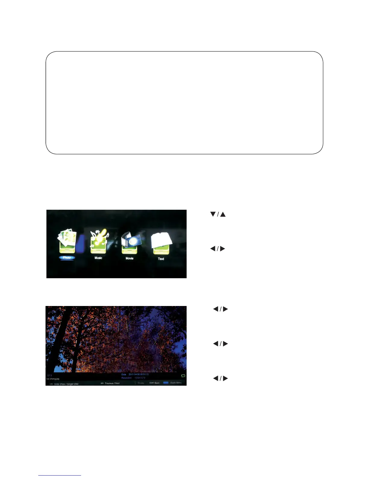 Note: Before operating USB menu, Plug in USB device, then press SOURCE button to