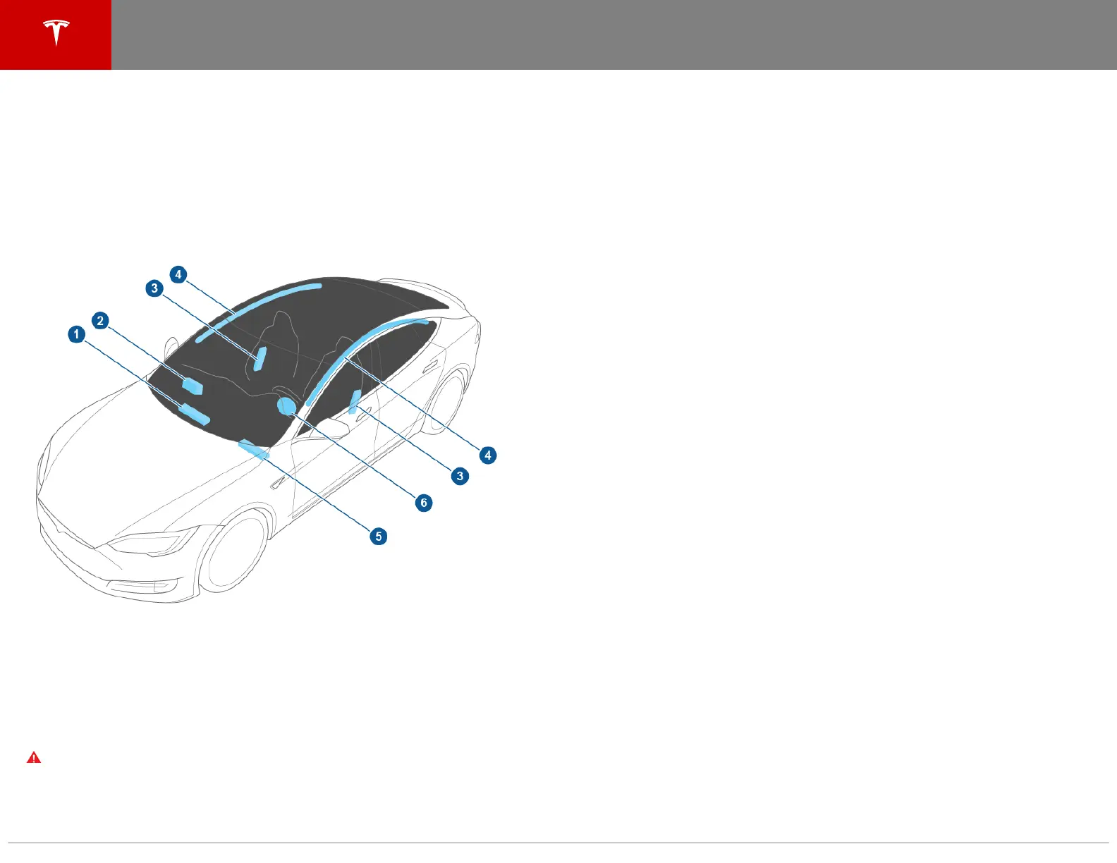 Model S is equipped with 6 airbags (8 in North America). Airbags are located in the approximate areas shown. Airbag warning