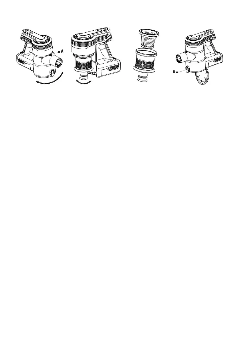 1. Lösen Sie den Staubbehälter (A) und entfernen Sie ihn vom Staubsaugergehäuse.