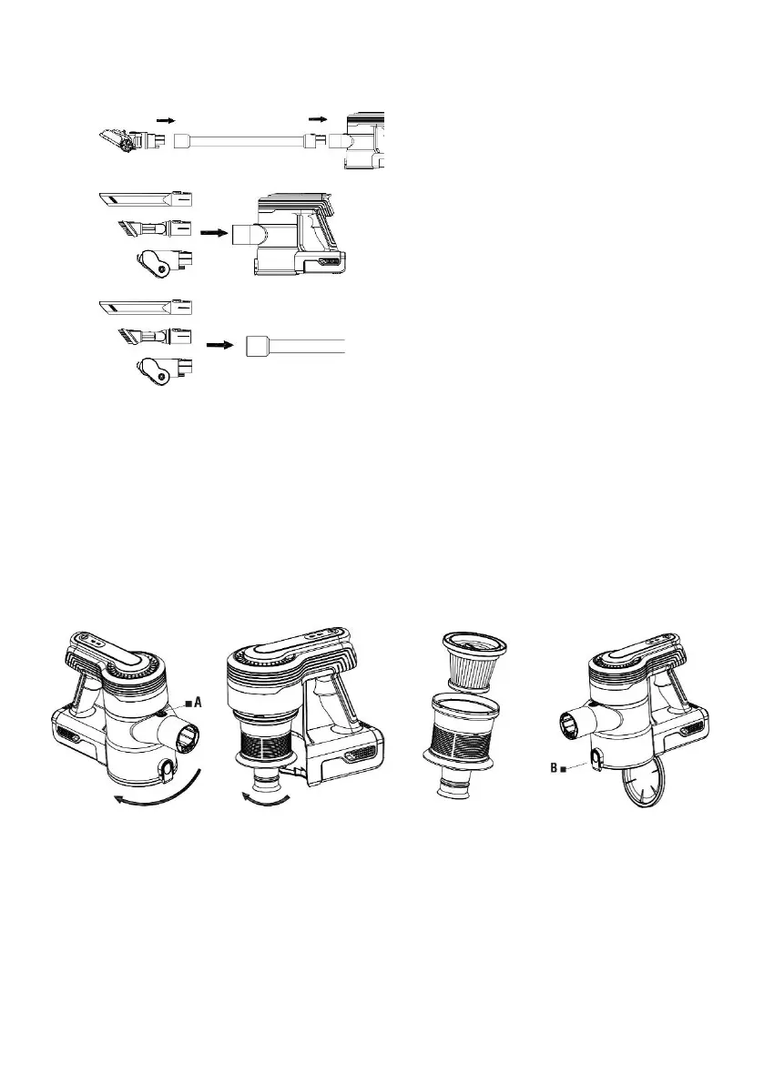 1. Uvoľnite zásobník na nečistoty (A) a vyberte ho z tela vysávača.
