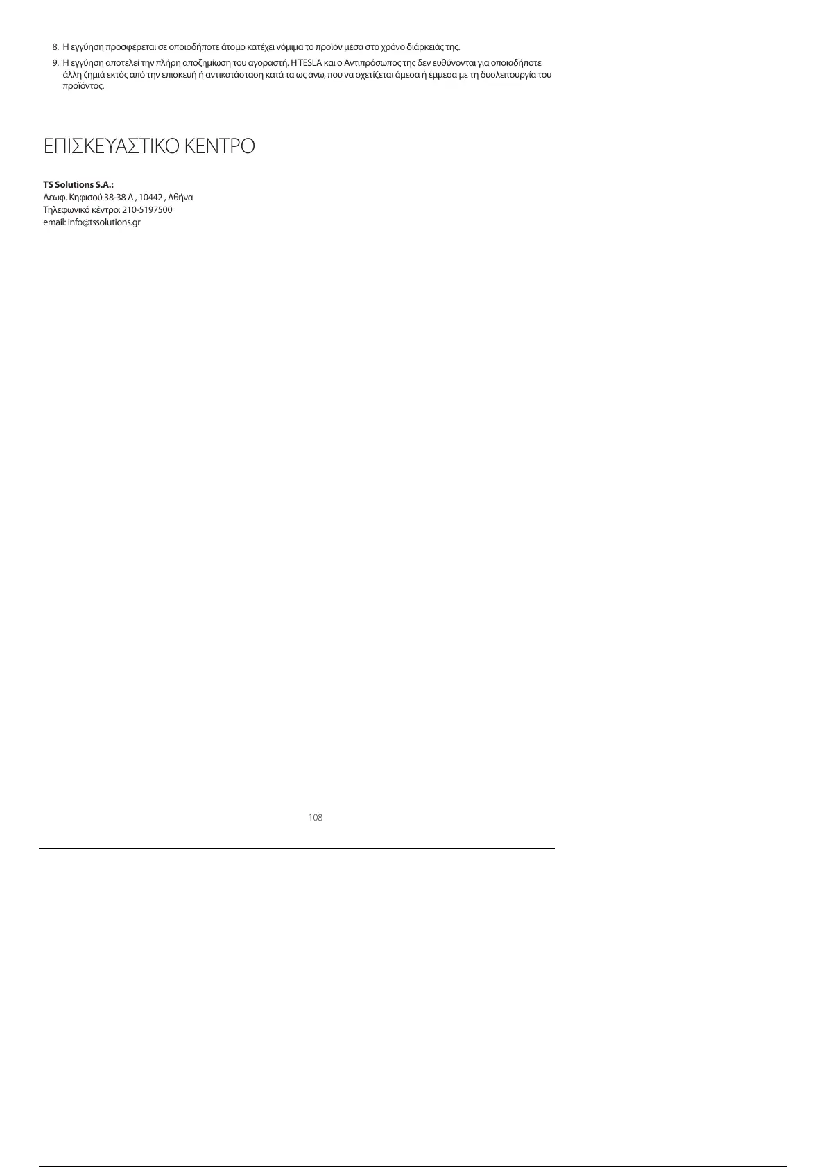 9. Η εγγύηση αποτελεί την πλήρη αποζημίωση του αγοραστή. Η TESLA και ο Αντιπρόσωπος της δεν ευθύνονται για οποιαδήποτε