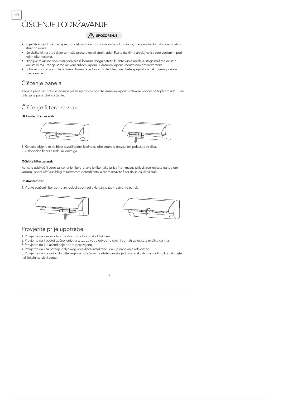 • Prije čišćenja, klima uređaj se mora isključiti kao i struja na duže od 5 minuta, inače može doći do opasnosti od