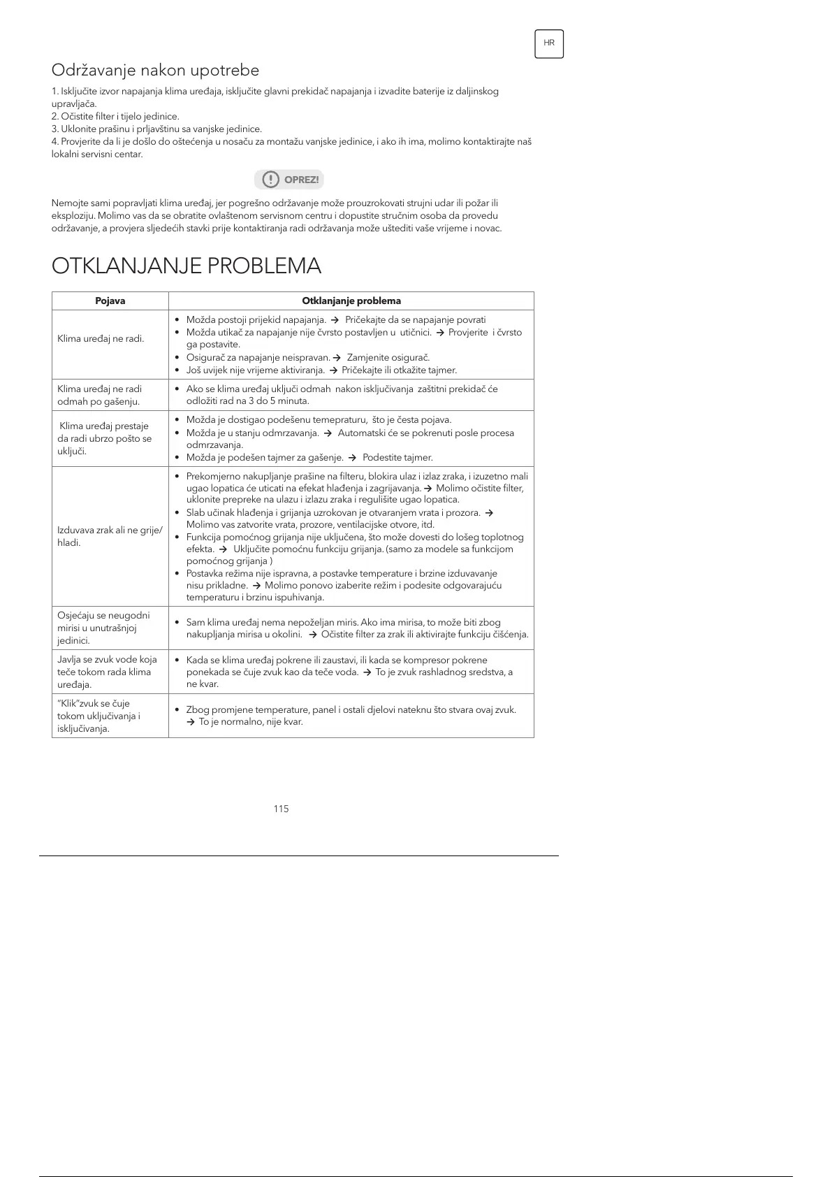 Nemojte sami popravljati klima uređaj, jer pogrešno održavanje može prouzrokovati strujni udar ili požar ili