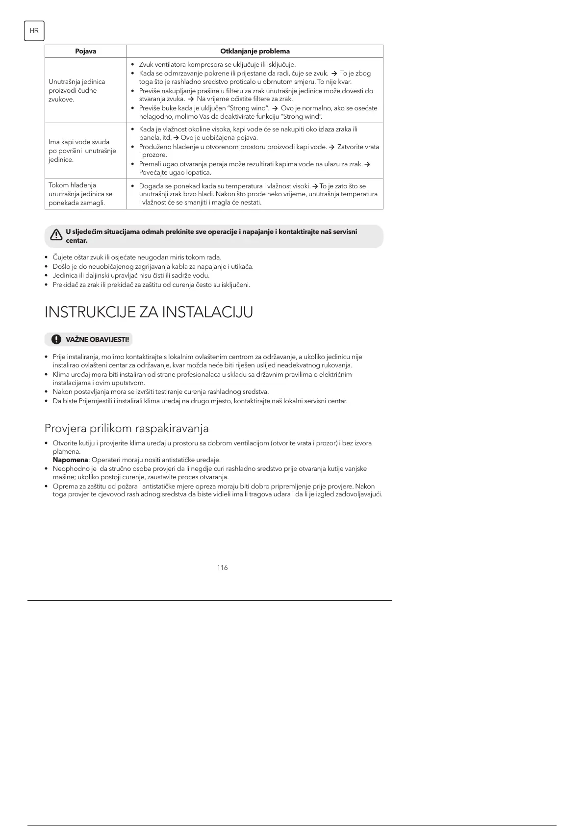 • Prije instaliranja, molimo kontaktirajte s lokalnim ovlaštenim centrom za održavanje, a ukoliko jedinicu nije
