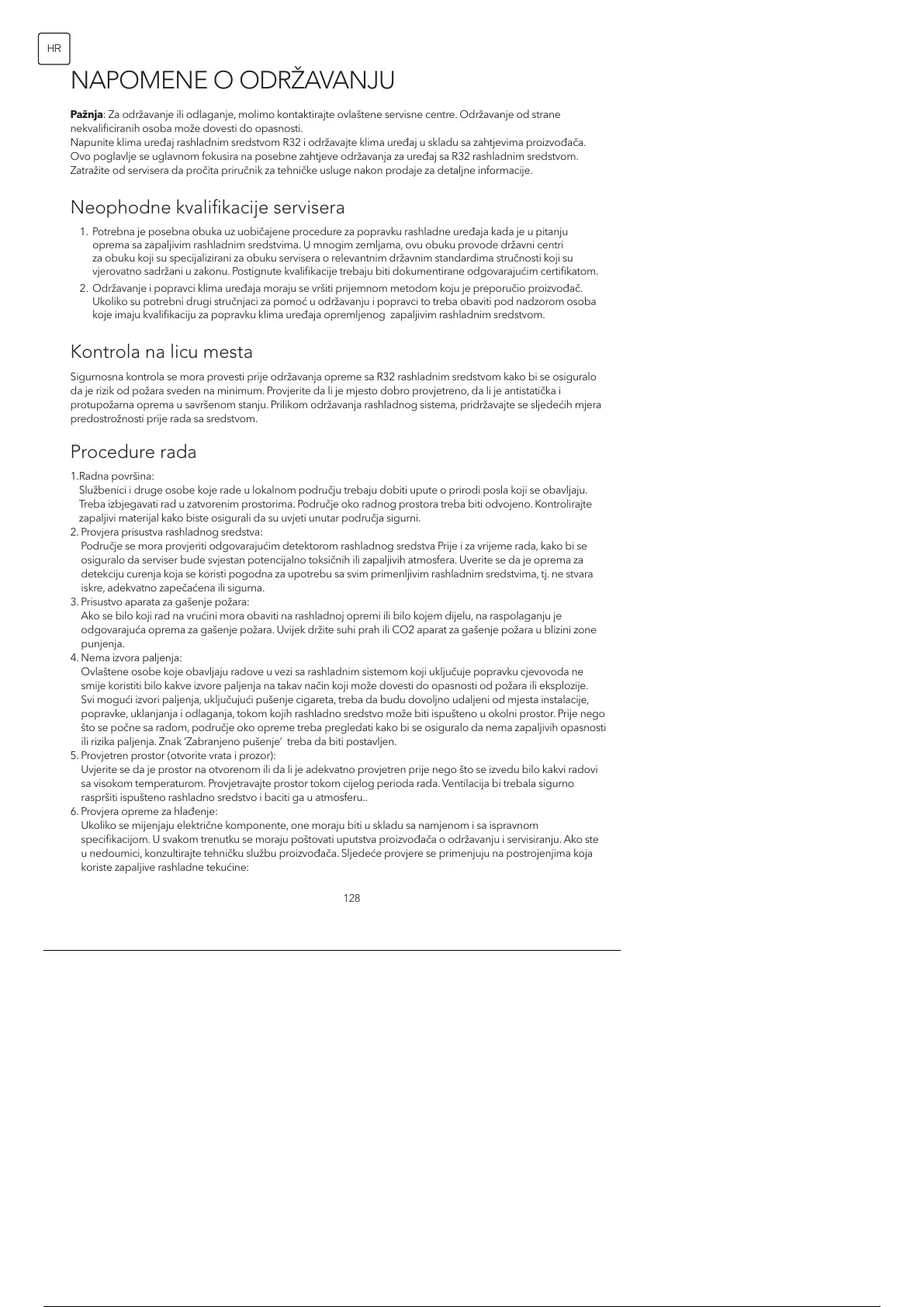 Ovo poglavlje se uglavnom fokusira na posebne zahtjeve održavanja za uređaj sa R32 rashladnim sredstvom.