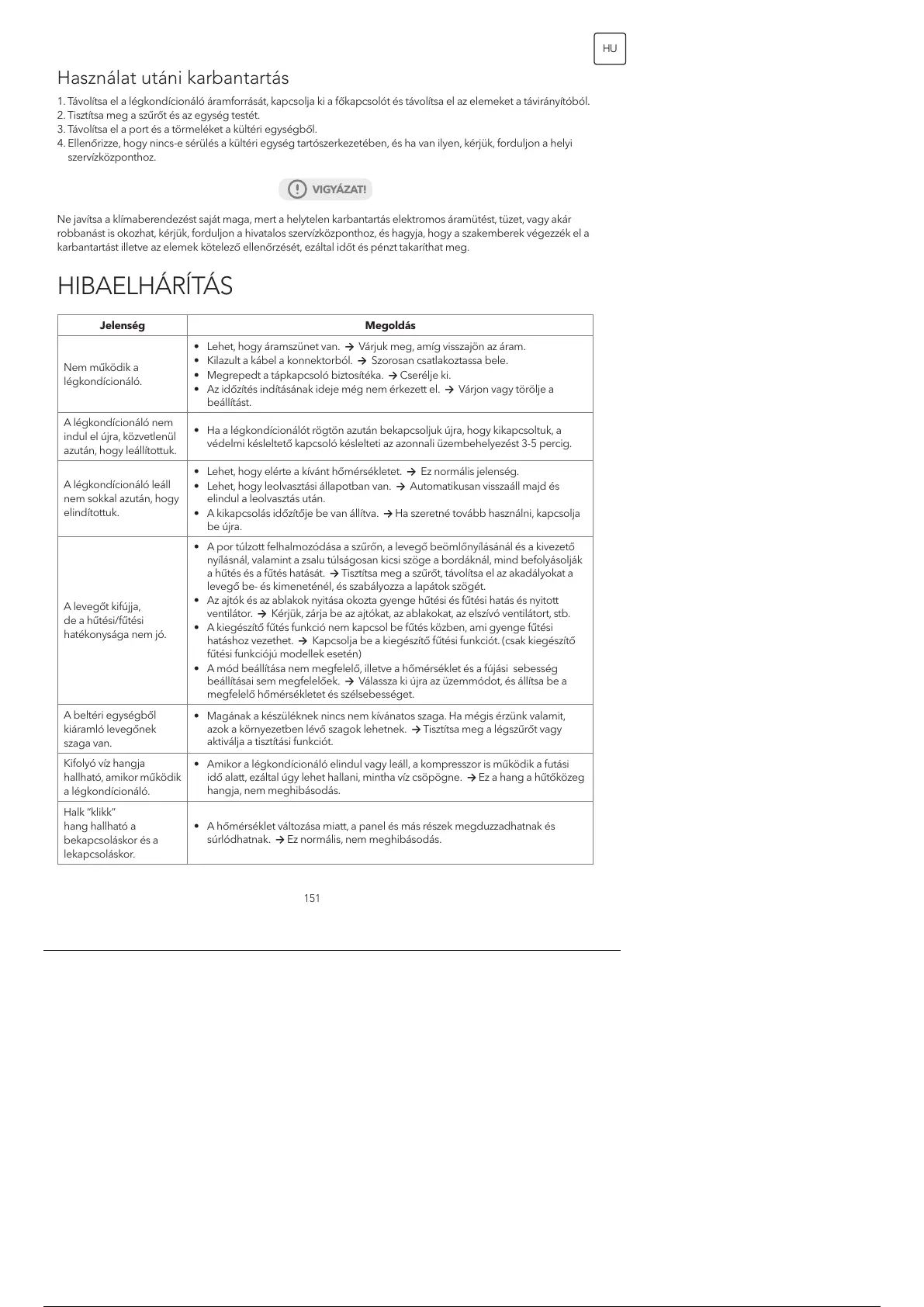 Ne javítsa a klímaberendezést saját maga, mert a helytelen karbantartás elektromos áramütést, tüzet, vagy akár