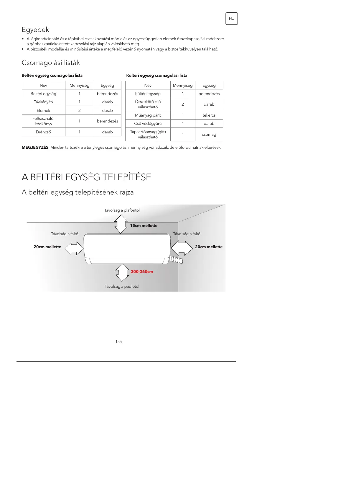 Beltéri egység csomagolási lista Kültéri egység csomagolási lista