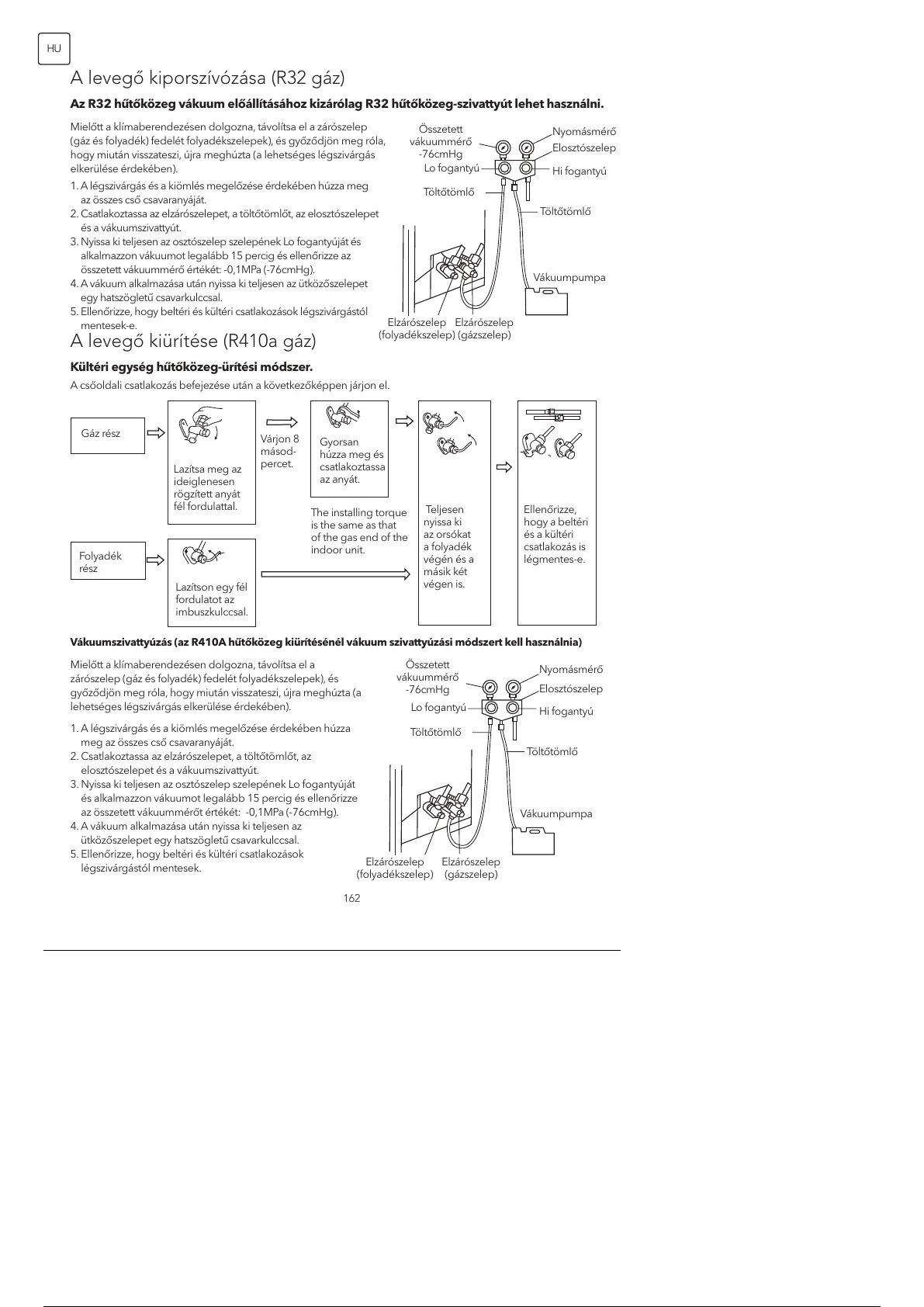 Vákuumszivattyúzás (az R410A hűtőközeg kiürítésénél vákuum szivattyúzási módszert kell használnia)