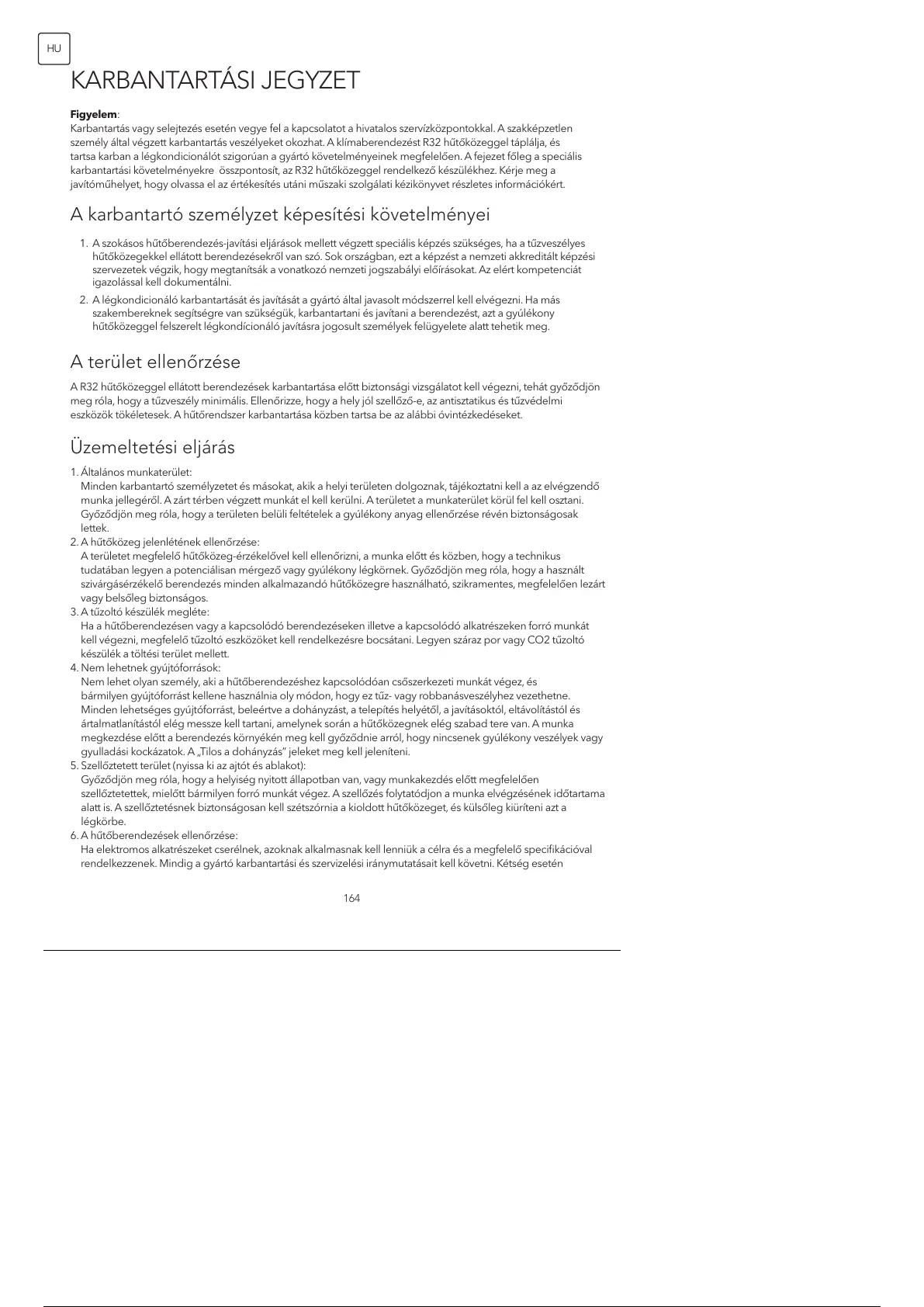 karbantartási követelményekre összpontosít, az R32 hűtőközeggel rendelkező készülékhez. Kérje meg a