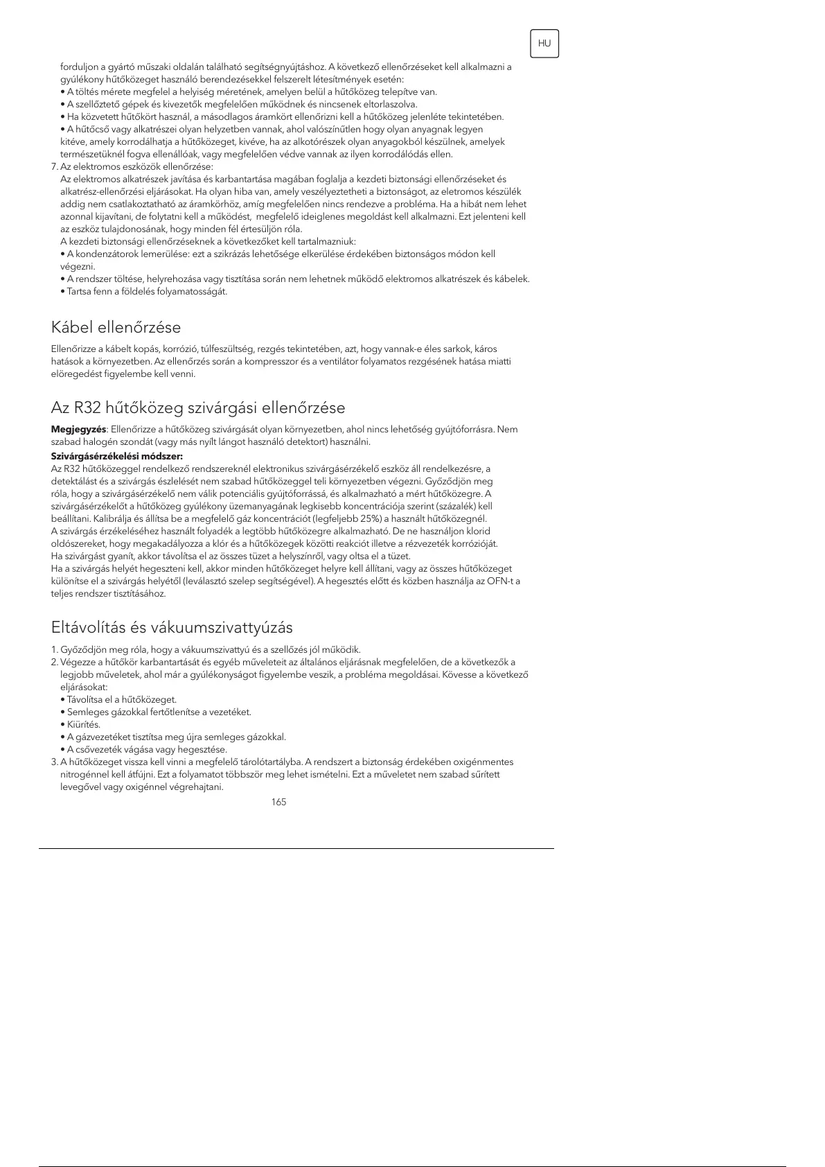 • A rendszer töltése, helyrehozása vagy tisztítása során nem lehetnek működő elektromos alkatrészek és kábelek.