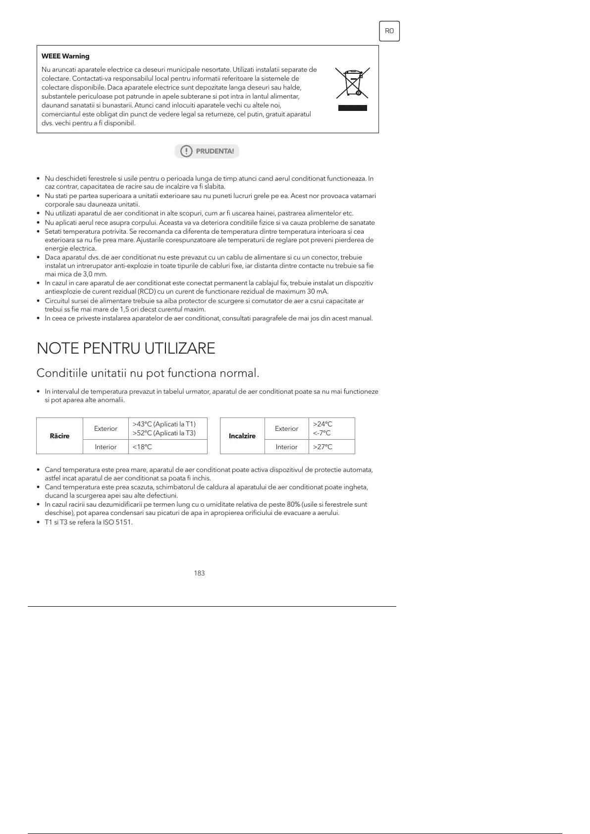 • In intervalul de temperatura prevazut in tabelul urmator, aparatul de aer conditionat poate sa nu mai functioneze