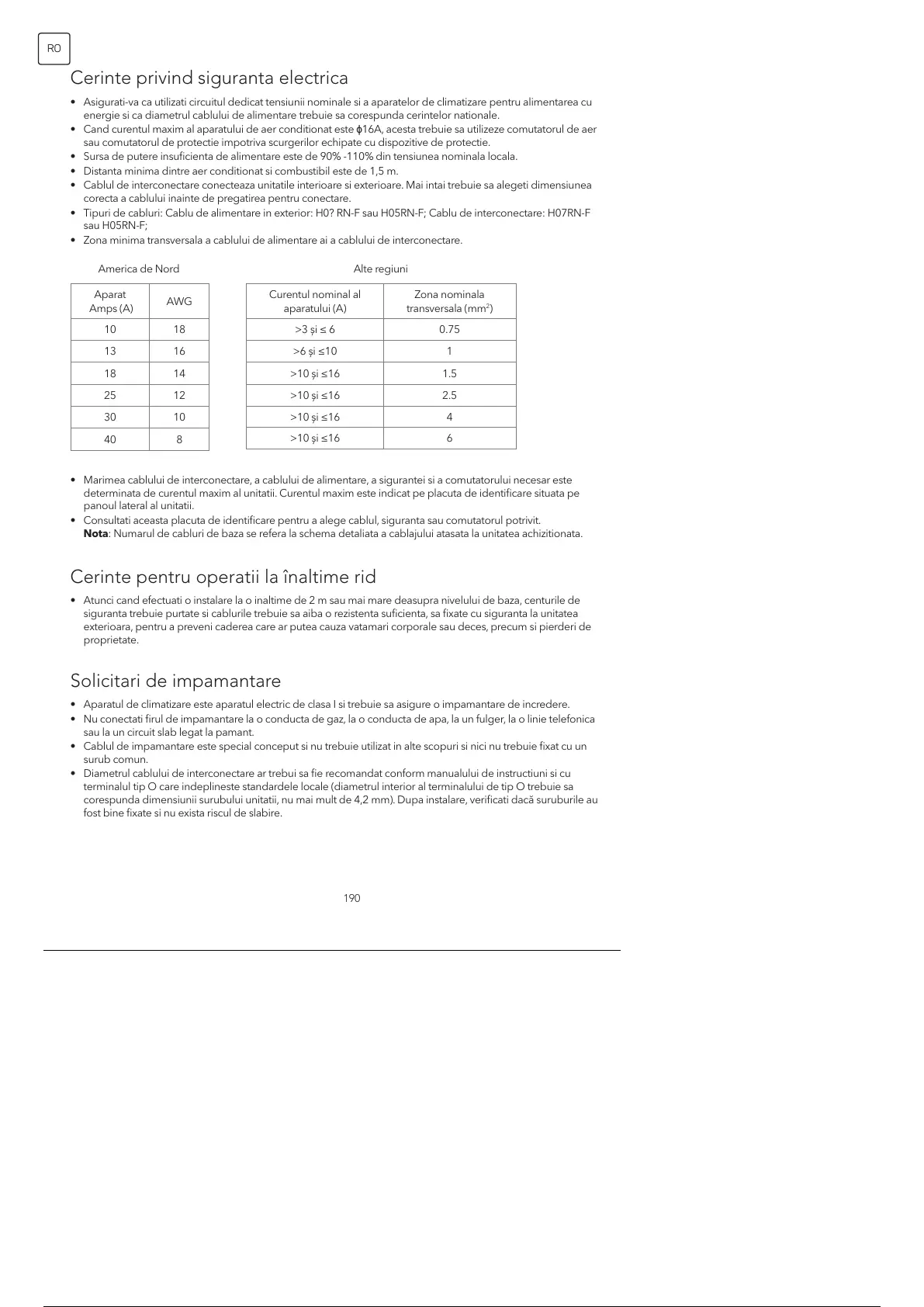 • Marimea cablului de interconectare, a cablului de alimentare, a sigurantei si a comutatorului necesar este