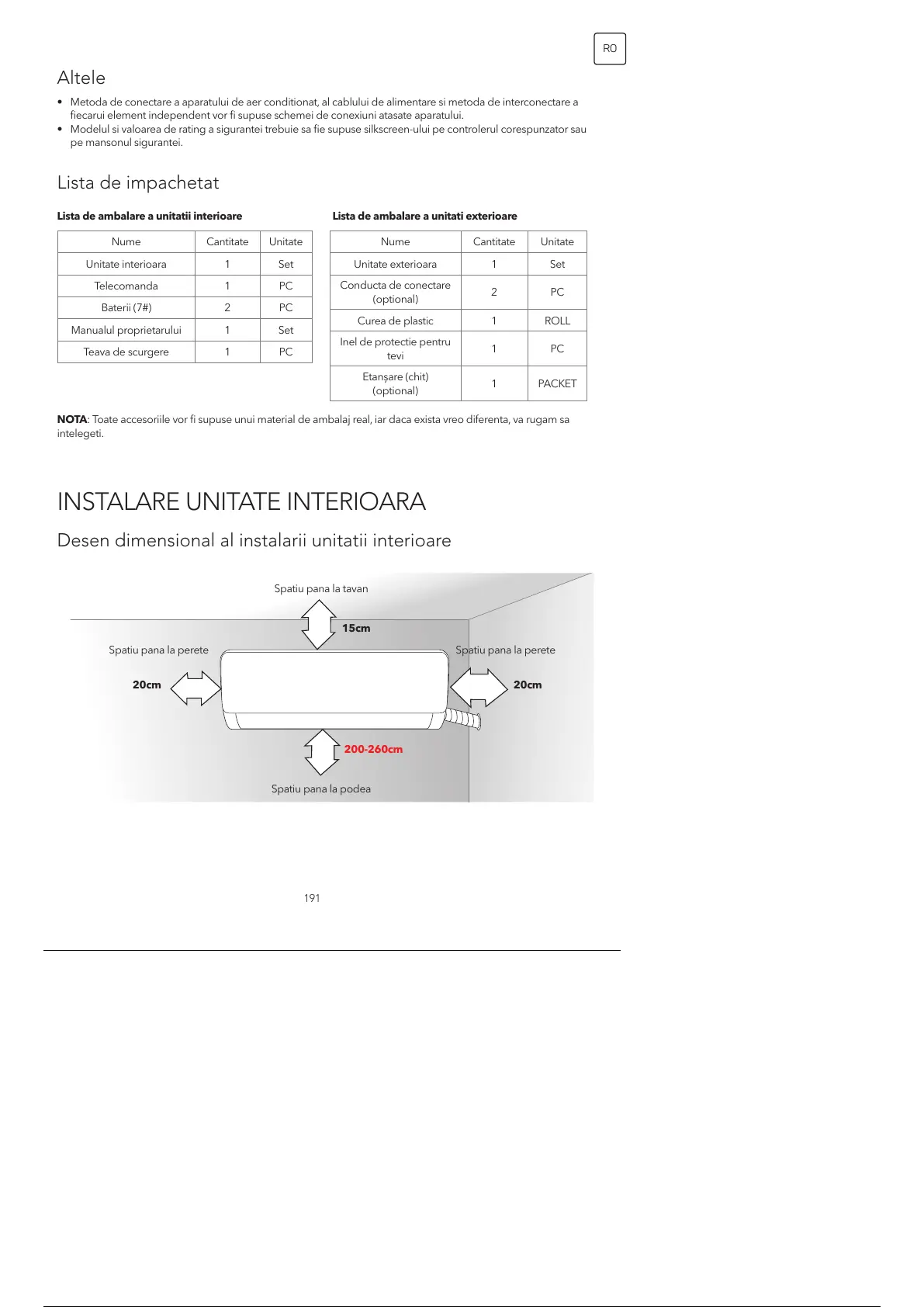 Lista de ambalare a unitatii interioare Lista de ambalare a unitati exterioare