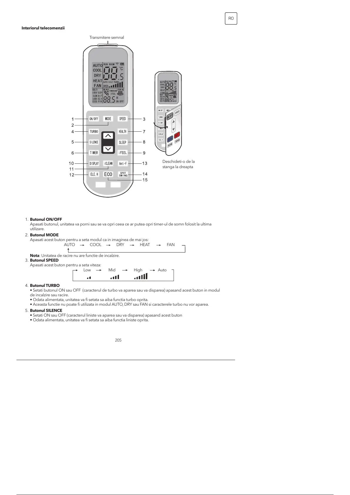 • Aceasta functie nu poate fi utilizata in modul AUTO, DRY sau FAN si caracterele turbo nu vor aparea.