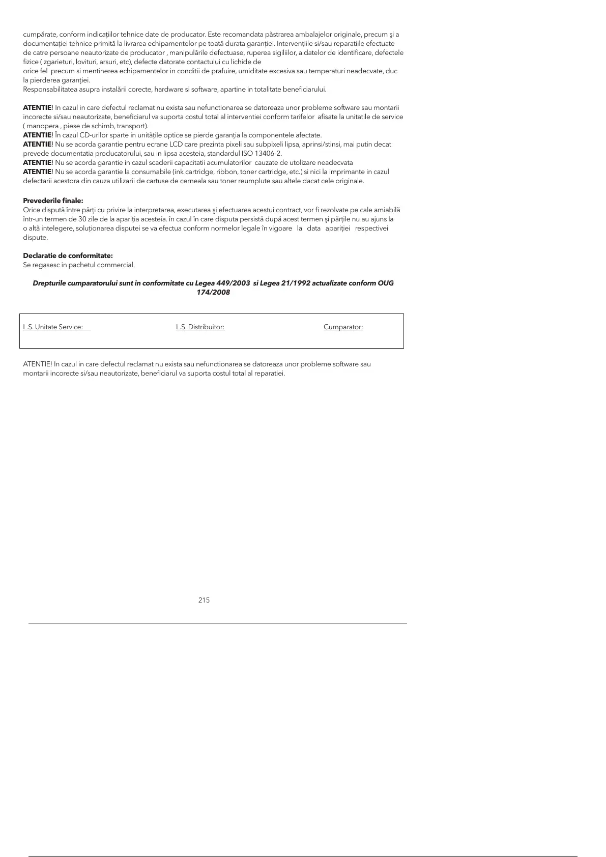 ATENTIE! Nu se acorda garantie la consumabile (ink cartridge, ribbon, toner cartridge, etc.) si nici la imprimante in cazul