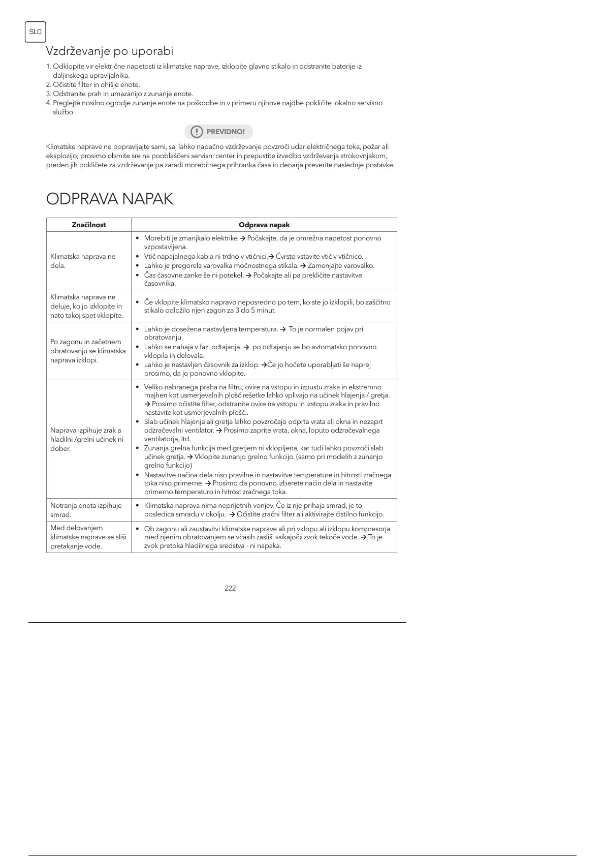 Klimatske naprave ne popravljajte sami, saj lahko napačno vzdrževanje povzroči udar električnega toka, požar ali