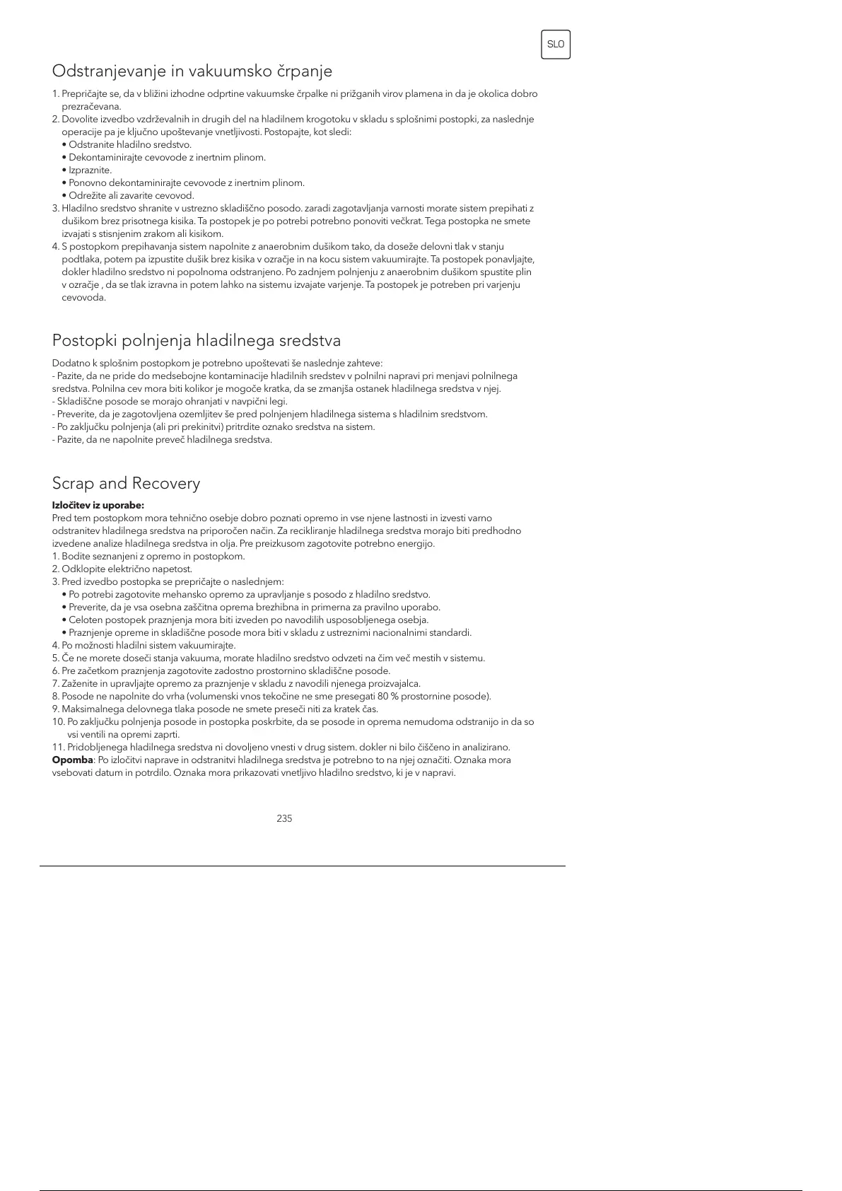 odstranitev hladilnega sredstva na priporočen način. Za recikliranje hladilnega sredstva morajo biti predhodno