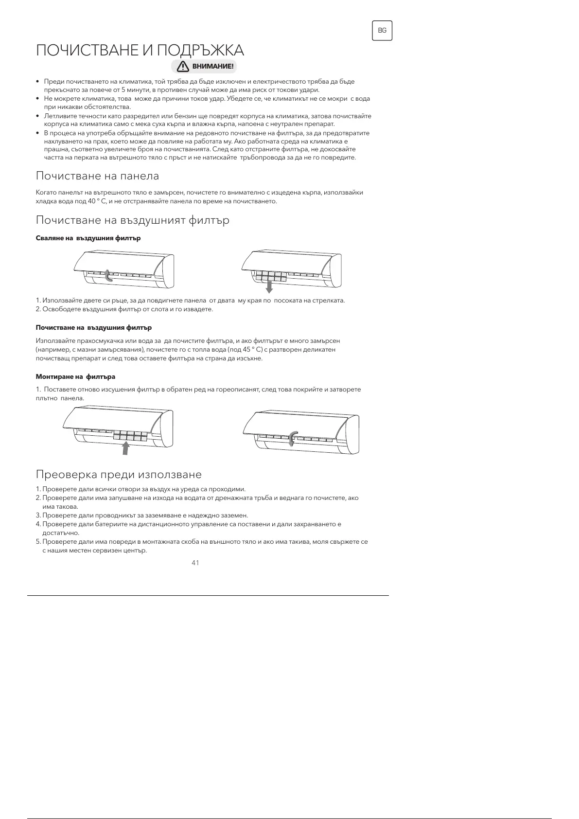• Летливите течности като разредител или бензин ще повредят корпуса на климатика, затова почиствайте