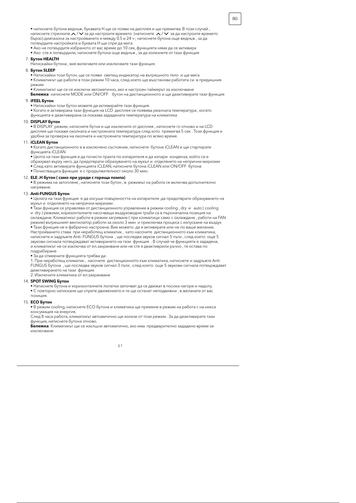 • Климатикът ще работи в този режим 10 часа, след което ще възстанови работата си в предишния
