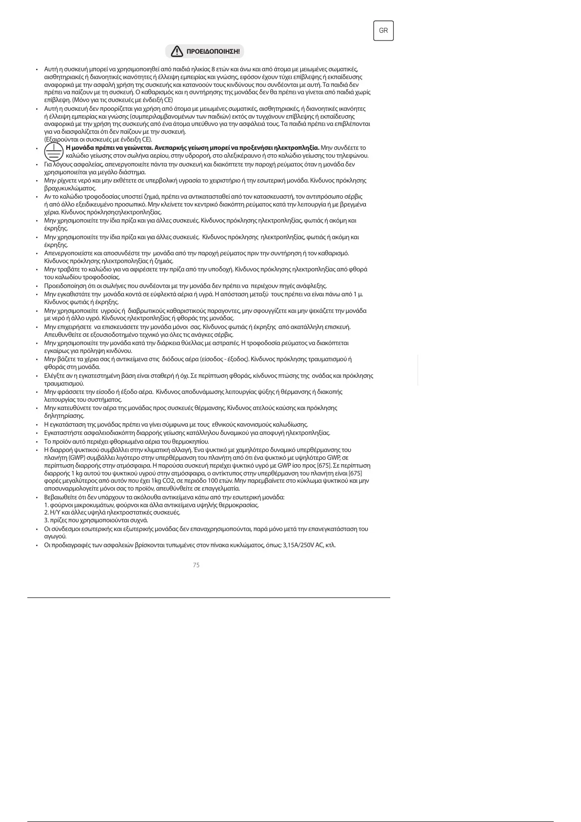 περίπτωση διαρροής στην ατμόσφαιρα. Η παρούσα συσκευή περιέχει ψυκτικό υγρό με GWP ίσο προς [675]. Σε περίπτωση