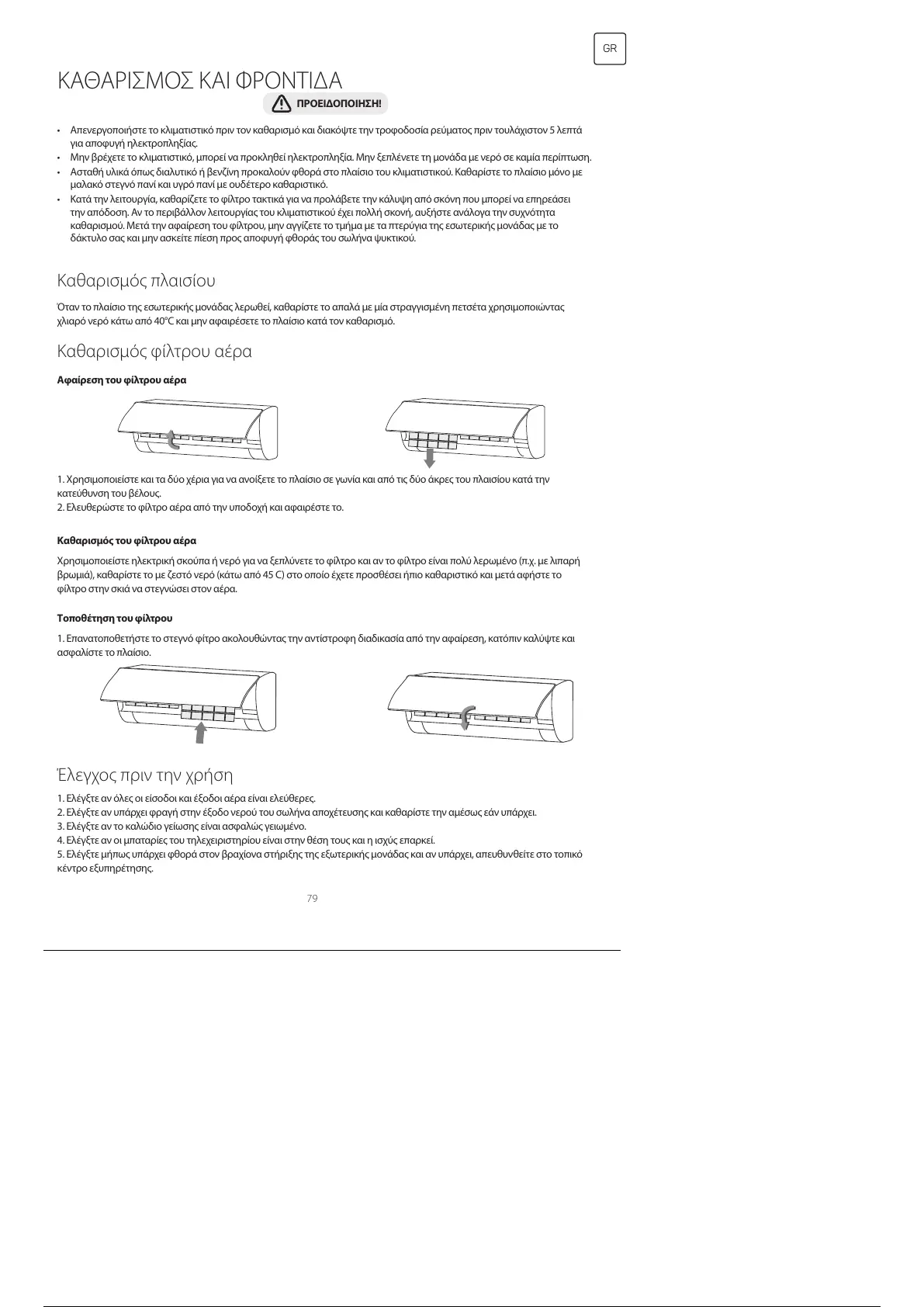 καθαρισμού. Μετά την αφαίρεση του φίλτρου, μην αγγίζετε το τμήμα με τα πτερύγια της εσωτερικής μονάδας με το