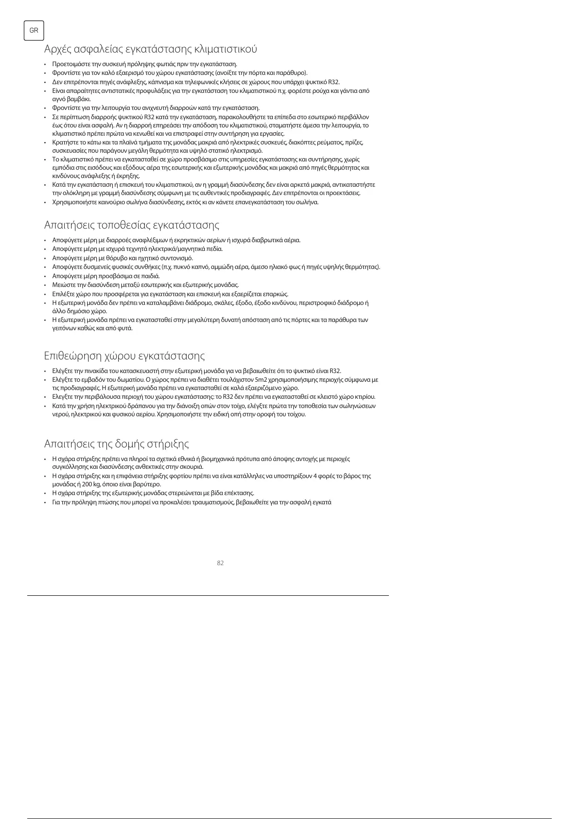 • Ελεγξτε την περιβάλουσα περιοχή του χώρου εγκατάστασης: το R32 δεν πρέπει να εγκατασταθεί σε κλειστό χώρο κτιρίου.