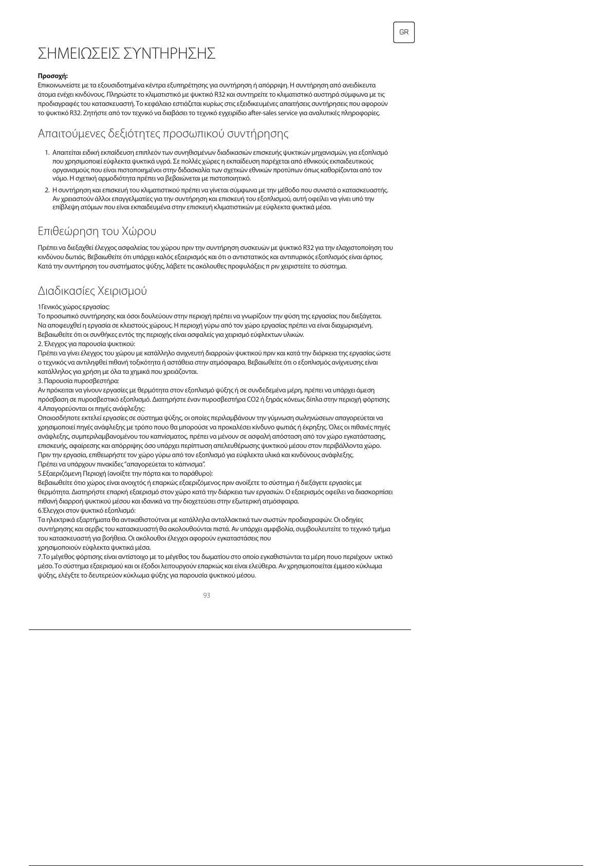 1. Απαιτείται ειδική εκπαίδευση επιπλεόν των συνηθισμένων διαδικασιών επισκευής ψυκτικών μηχανισμών, για εξοπλισμό