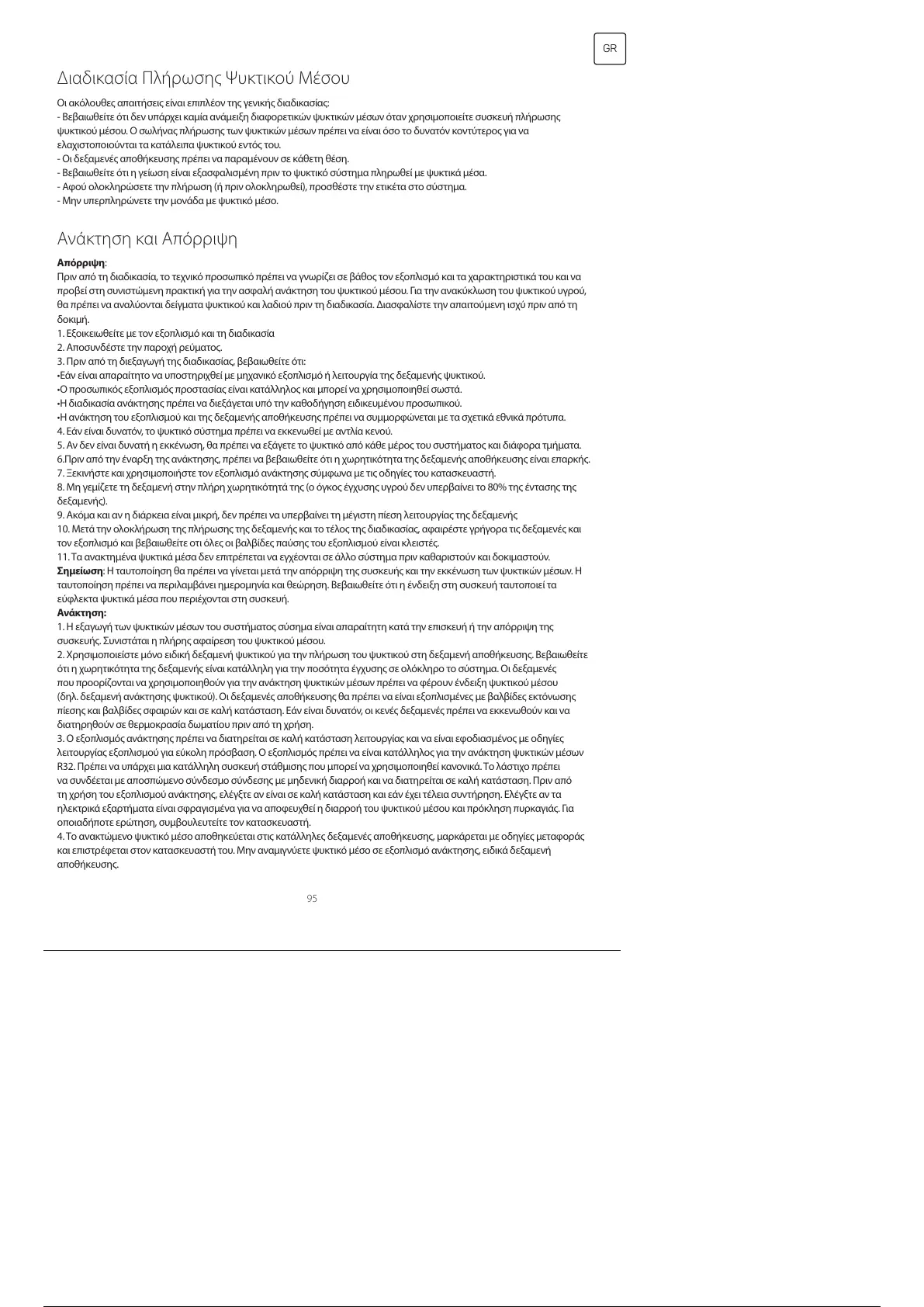 •Η ανάκτηση του εξοπλισμού και της δεξαμενής αποθήκευσης πρέπει να συμμορφώνεται με τα σχετικά εθνικά πρότυπα.