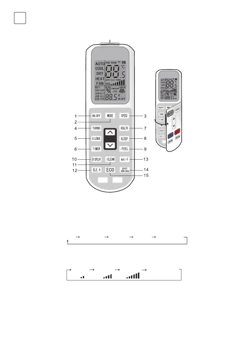 • Vklop ali izklop turbo načina (simbol za turbo se pojavi ali izgine) v načinu dela »hlajenje« ali »gretje«.