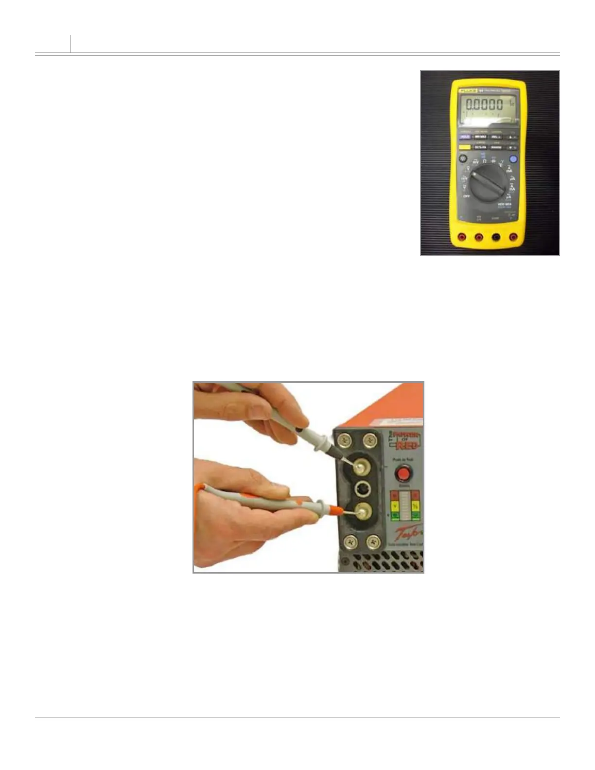 probe on the negative post. The multimeter display should read approximately 28.5 Vdc (±0.5 Vdc) when