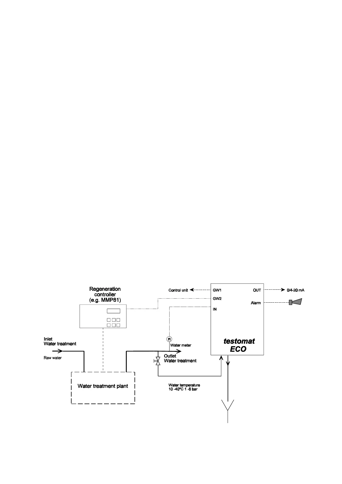 The feed water flows through the measuring chamber then, via the outlet pipe, to the drain (hose connection internal