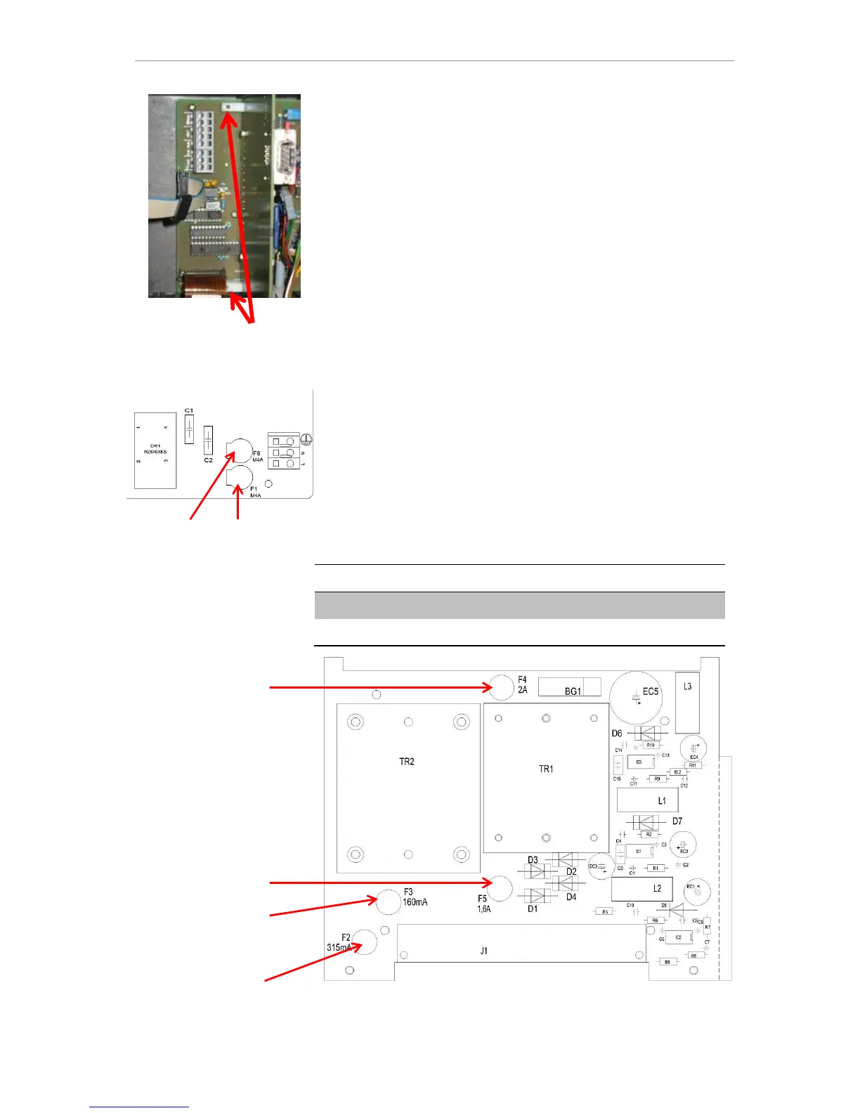 The main fuses F1 and F6 (4A MT) for outputs and equipment are
