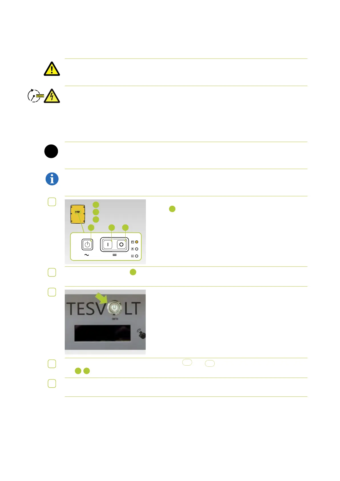 • Discharging the capacitors in the battery inverter can take several minutes after switching off. For