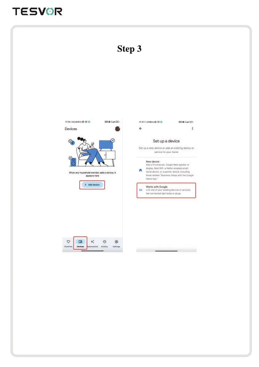 1.Open your Google Home App, click “Device” and “Add device”, then choose