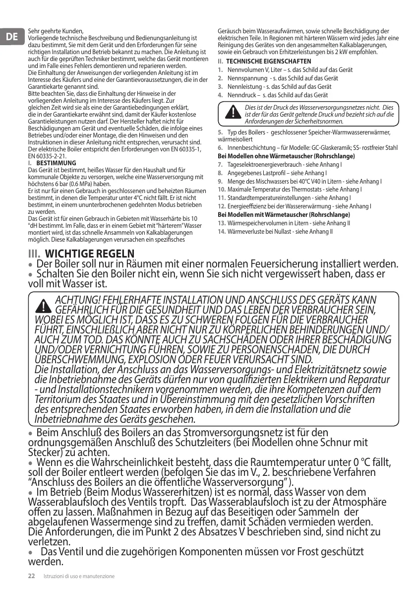 ACHTUNG! FEHLERHAFTE INSTALLATION UND ANSCHLUSS DES GERÄTS KANN