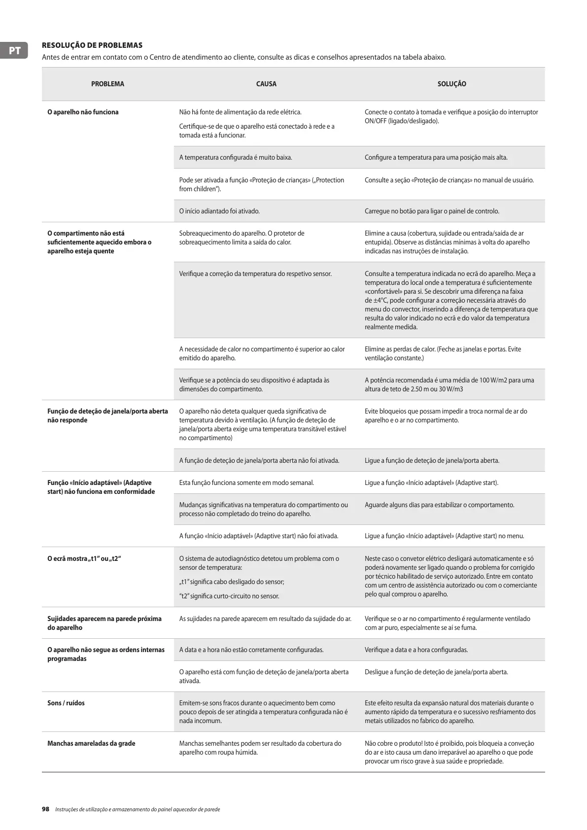 98 Instruções de utilização e armazenamento do painel aquecedor de parede