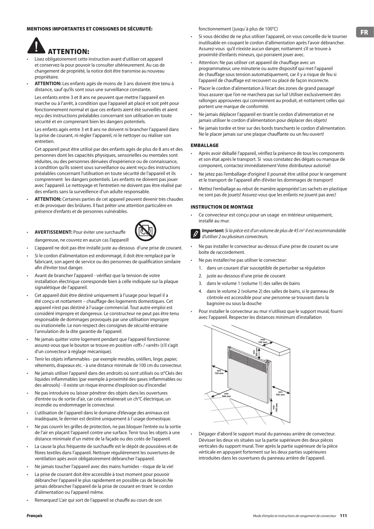 Mode d’emploi et instructions de rangement de convecteur 111Français