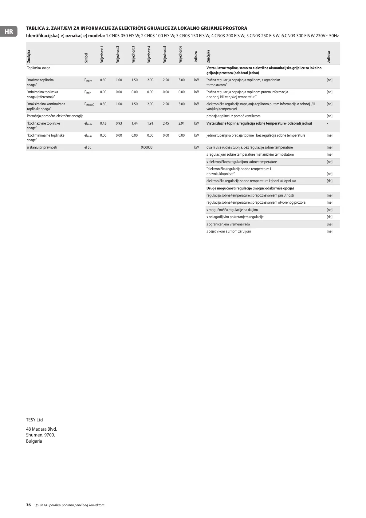 TABLICA 2. ZAHTJEVI ZA INFORMACIJE ZA ELEKTRIČNE GRIJALICE ZA LOKALNO GRIJANJE PROSTORA