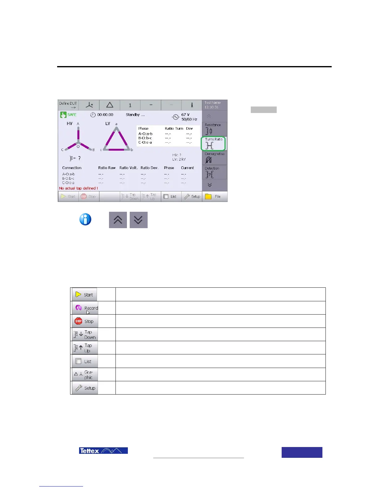 While in turns ratio application, following actions are available in the button key bar. The buttons